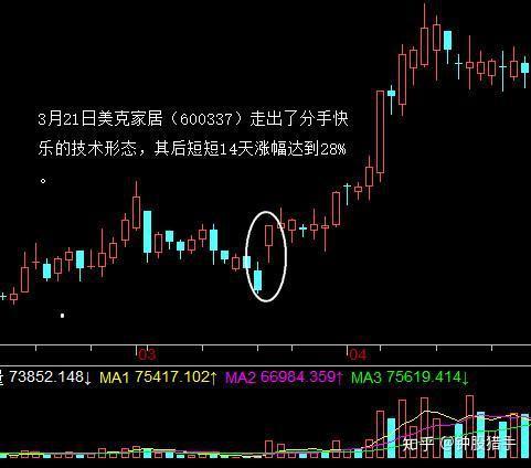 股价的阴阳线分离,而且是用涨停板这样最坚决的方式和阴线决裂,故得分手快乐之战法。