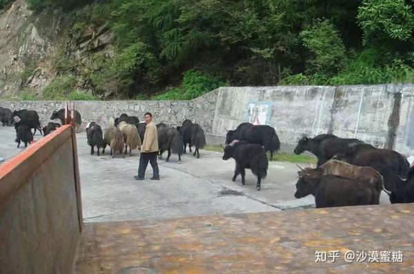 在货车后箱上看着牦牛群